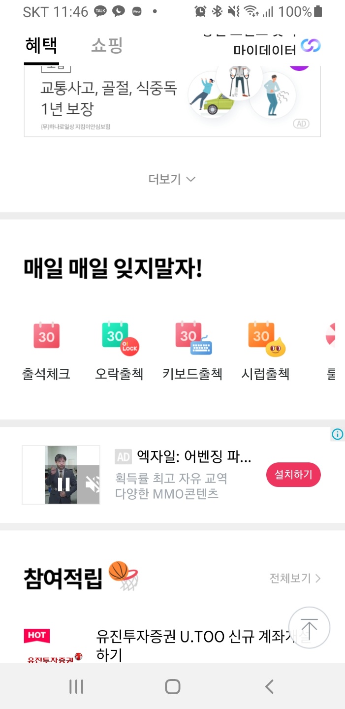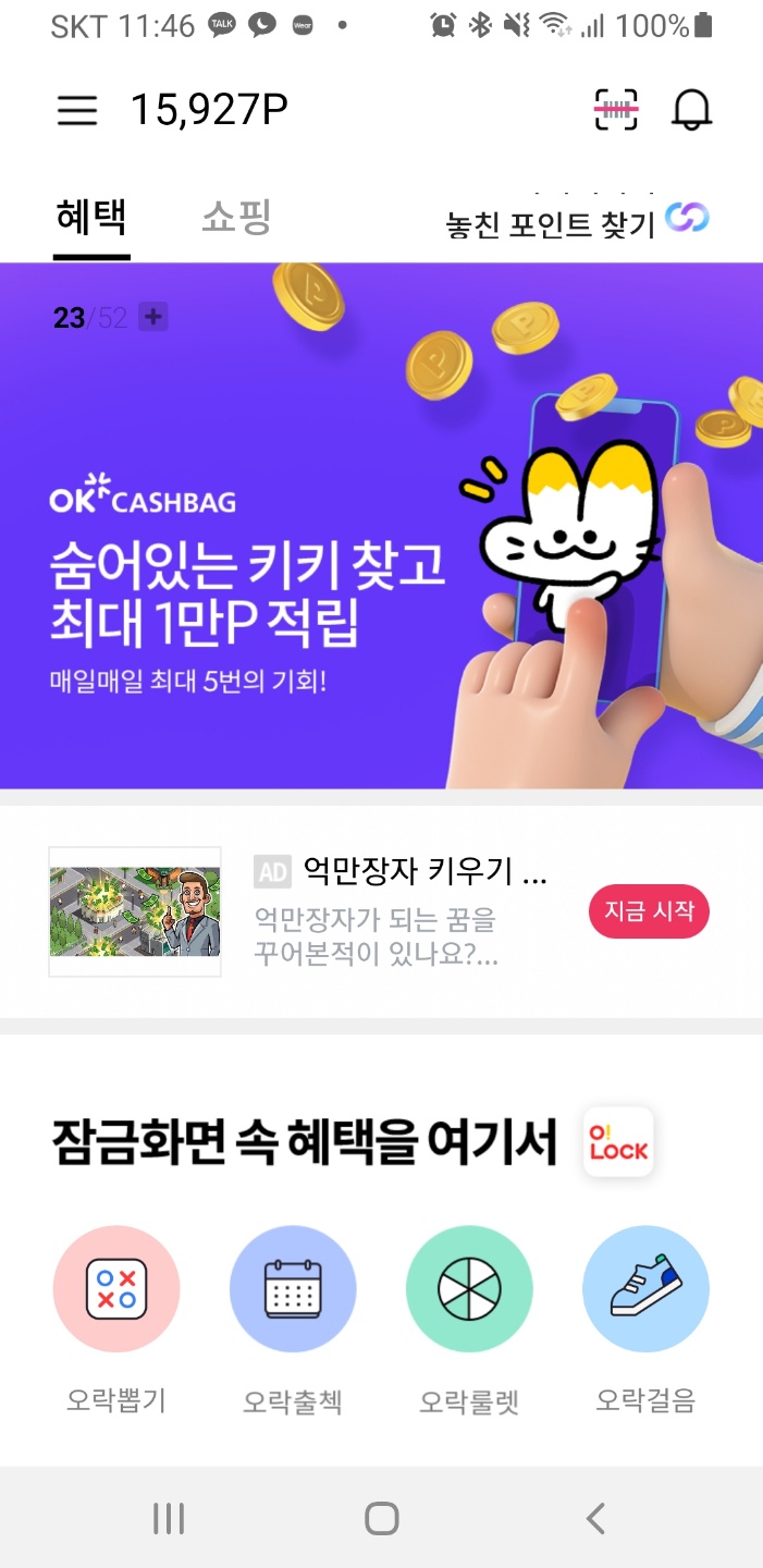 한방에 큰 것이 아닌 말 그대로 티끌을 모아 태산이 아닌 태산이 되기 위한 기본적인 준비라고 생각하는 것이 더 이롭겠네요. 출석 또한 OK캐시백과 제휴된 오락, 키보드 사용 시 받을 수 있는 적립 혜택, 시럽, 오! 라방 등과 같은 여러 가지 출석 이벤트를 한 앱으로 사용할 수 있는 장점이 있습니다.