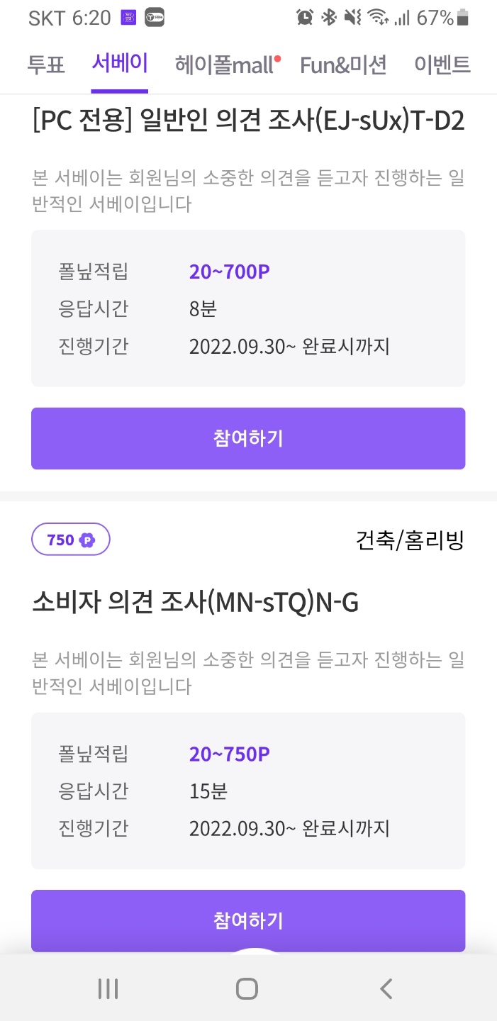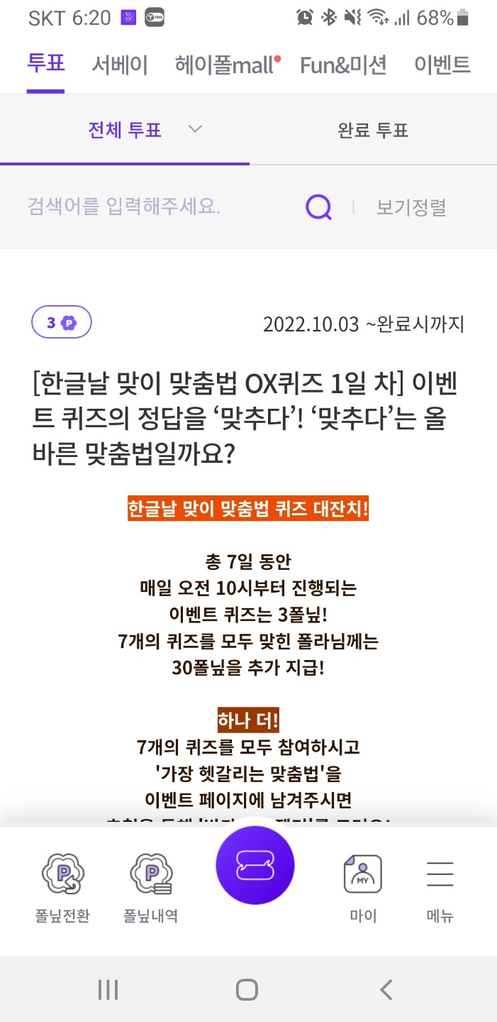헤이폴은 베너에서 투표, 서베이, FUN&미션, 이벤트를 통해 폴닢을 적립할 수 있습니다. 먼저 투표 텝을 내가 참여하지 않은 지난 투표들도 투표의 기한이 남아있다면 참여할 수 있습니다. 이벤트성 투표는 3포인트를, 보통의 투표는 1포인트의 폴닢을 적립할 수 있고 투표의 내용도 직접 유저가 신청하여 올릴 수 있는 등 참여형 투표가 많고 흥미로운 내용의 투표들도 많아서 상식도 키울 수 있다는 점에서 조금은 재미를 느낄 수 있습니다.