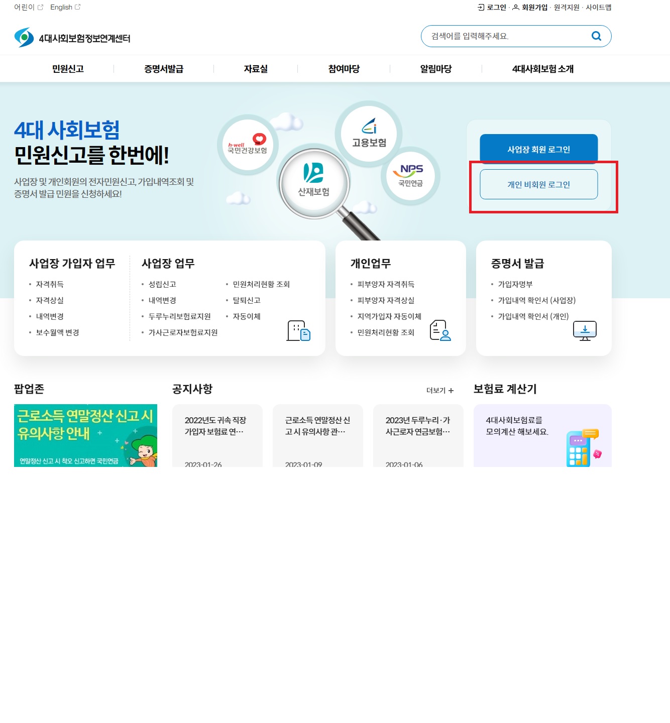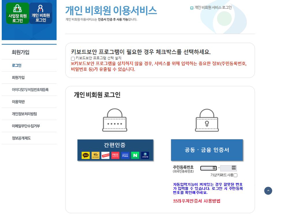 1. 개인 비회원 로그인 : 로그인을 먼저 해야 합니다.