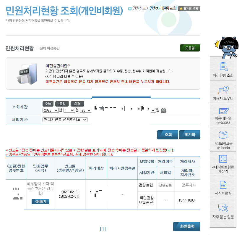 오른쪽 간편 텝을 보면 민원처리 현황을 보실 수 있습니다.