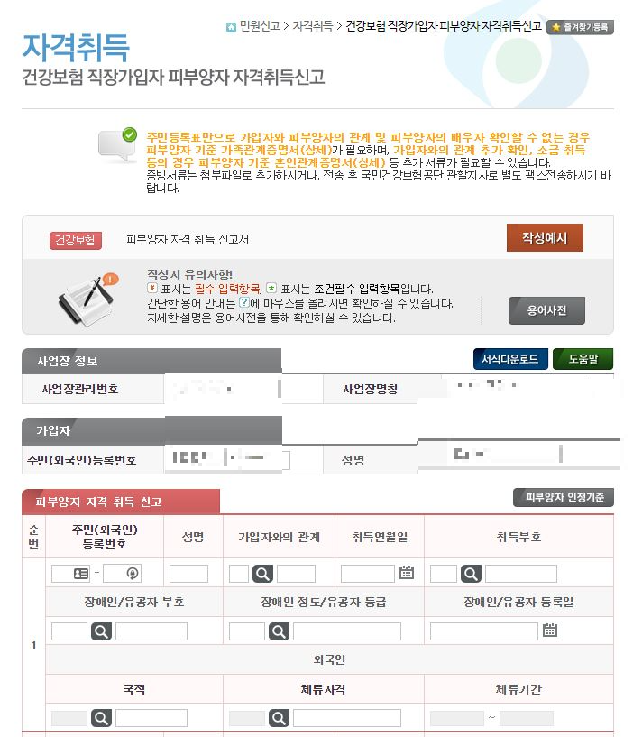 취득연원일 : 피부양자 자격취득일자를 적어줍니다.