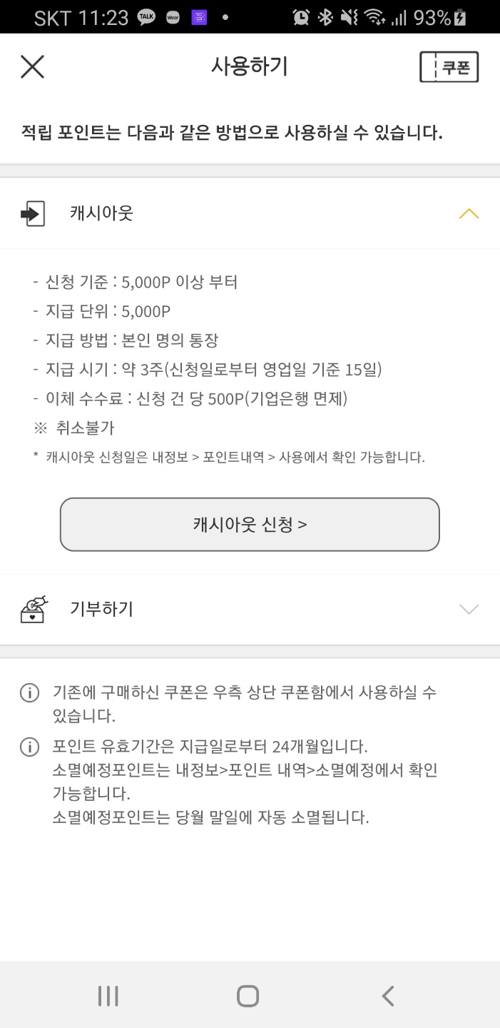 이렇게 적립한 포인트는 5,000 포인트 이상일 시 캐시 아웃 통장으로 현금화할 수 있으며, 기부도 가능합니다. 저는 물론 입이 아프도록 이야기했죠? 현금화해서 자산(주식)으로 바꾸려고 합니다.