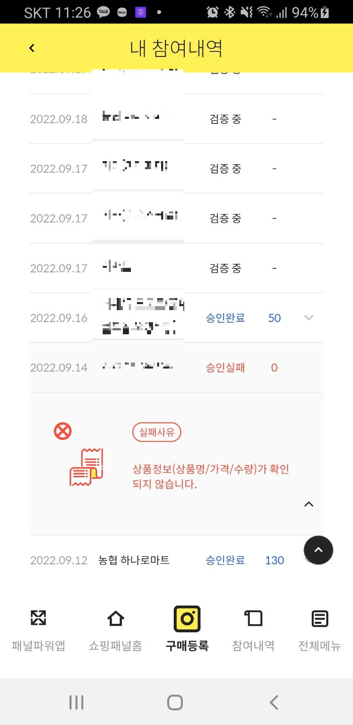 쇼핑 패널은 참여 이력을 통해 내가 올린 영수증의 리워드가 성공했는지, 승인에 실패했는지 확인할 수 있고 비승인 상태의 영수증은 왜 승인이 되지 않았는지에 대한 사유가 적혀 나옵니다. 그런데 지금은 승인 날짜가 너무 오래 걸려요... 아직 틀이 잡히지 못한 아쉬움이 남아있습니다.