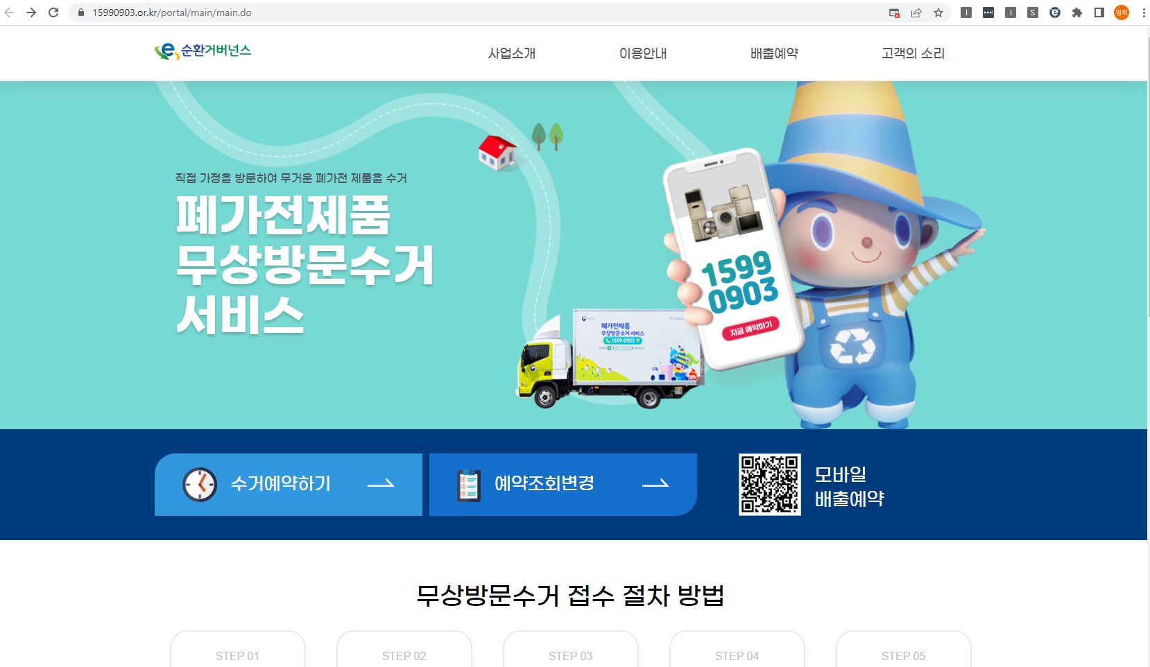 두 번째로 소개해드릴 방법 때문에 포스팅을 하게 되었습니다. 바로 <폐가전무상배출예약시스템>을 이용하는 것입니다. 이 시스템은 전국 어디서나 신청이 가능하고, 소형가전도 5개 이상 묶어서 배출하면 직접 기사님이 집까지 찾아오셔서 수거를 해갑니다. 희망 날짜까지 입력이 가능하기 때문에 정말 유용한 제도입니다.