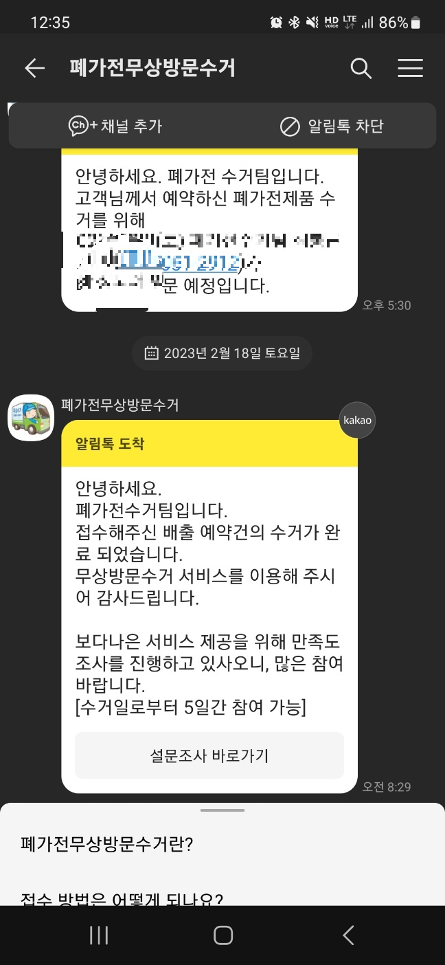 그런 다음 기사님이 배정되어 언제 방문한다는 안내 톡이 오고, 수거가 완료된 다음에는 친절하게 완료 메시지도 보내줍니다ㅎㅎ