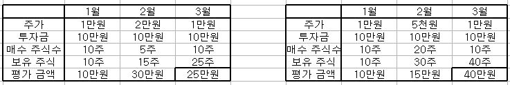 두 번째 경우도 10주를 추가하여 (총 투자금 30만 원 - 자산 40주 X1 만 원=40만 원)