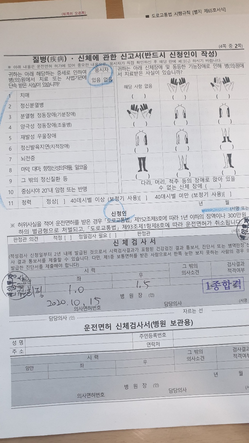 저는 다행스럽게도 2년 전 신검 기록이 남아있어서 별도의 신체검사는 하지 않았고, 바로 서류만 작성해서 면허증을 발급받았습니다. 사람이 많지 않아서 10분 정도 기다려서 새 면허증을 발급받았고, 전체 걸린 시간은 접수에서 수납까지 30분 정도 소요되었습니다.