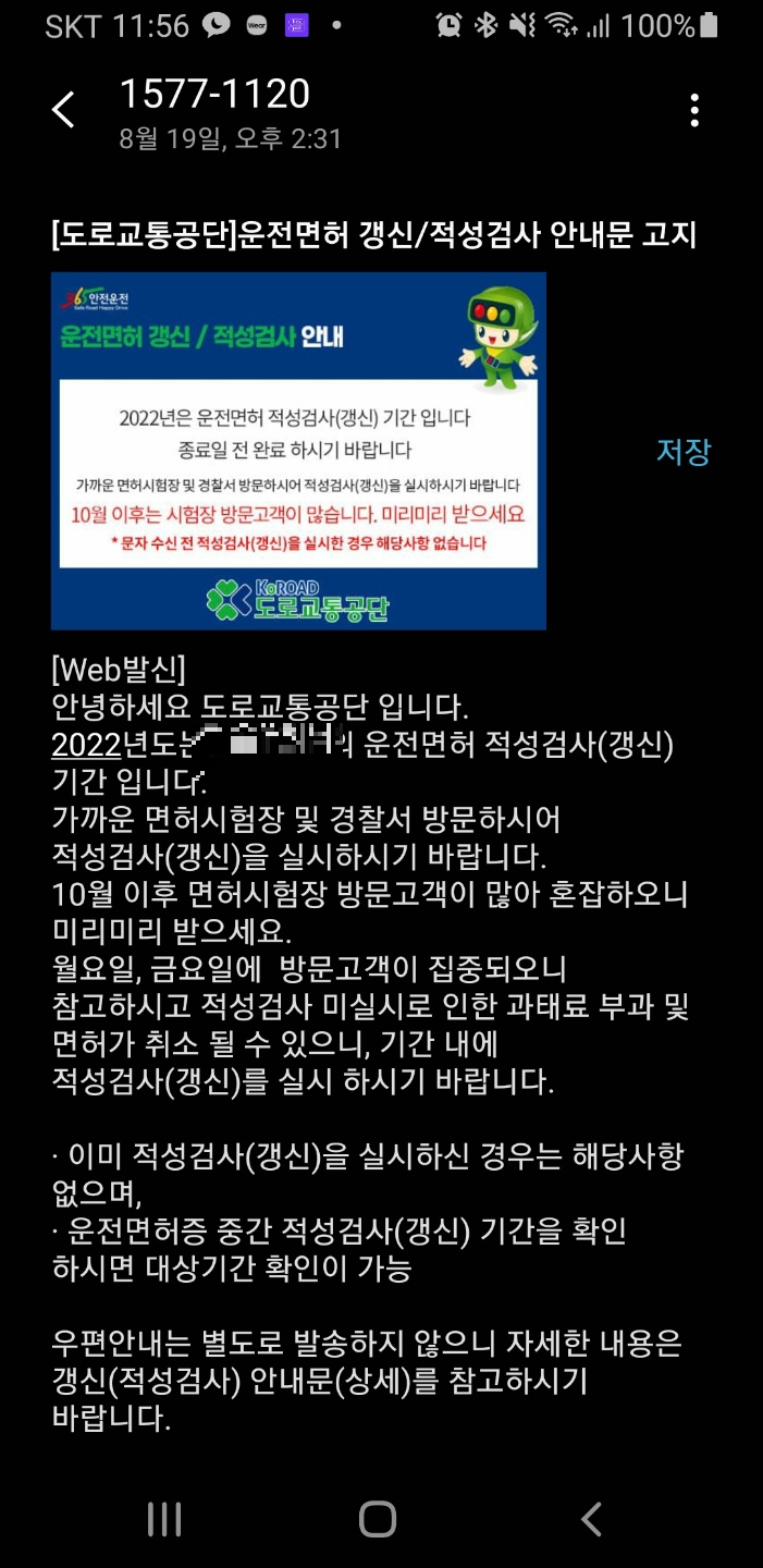 지난 8월에 도로교통공사에서 문자가 딱 왔습니다. 올해가 제 면허 갱신기간이라고 하더군요..ㄷㄷ