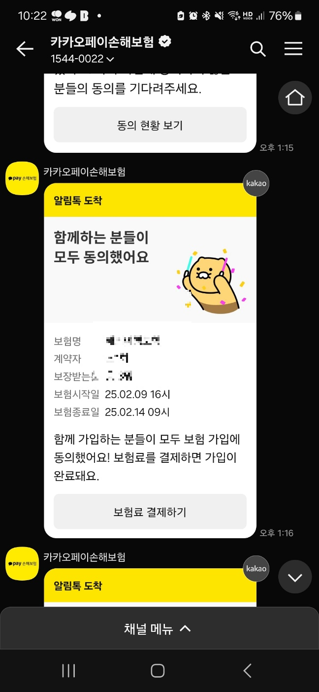 7. 접수를 하면 카톡으로 메세지가 오고 모두의 동의를 기다리게 됩니다. 모두가 동의하면 다음 단계로 넘어가요. 결제를 하고 최종 확인 메시지가 옵니다.