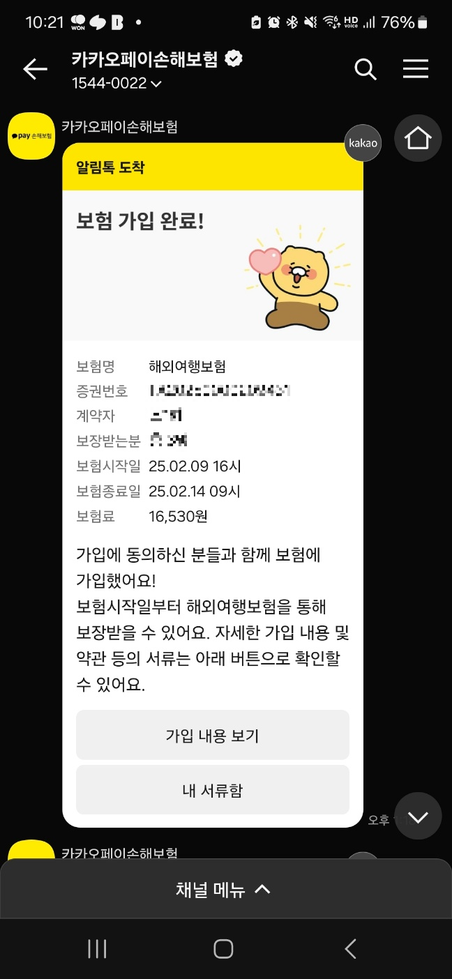 8. 최종 가입 완료 메세지가 왔습니다. 성인 3명에 16,530원이라니... 2월 9일에서 14일까지 하루 평균 인당 1,100원 정도 되는 금액입니다. 그리고 더 좋은 점은 무사고로 귀국했을 때 일정 금액을 환급해 준다는 것입니다.