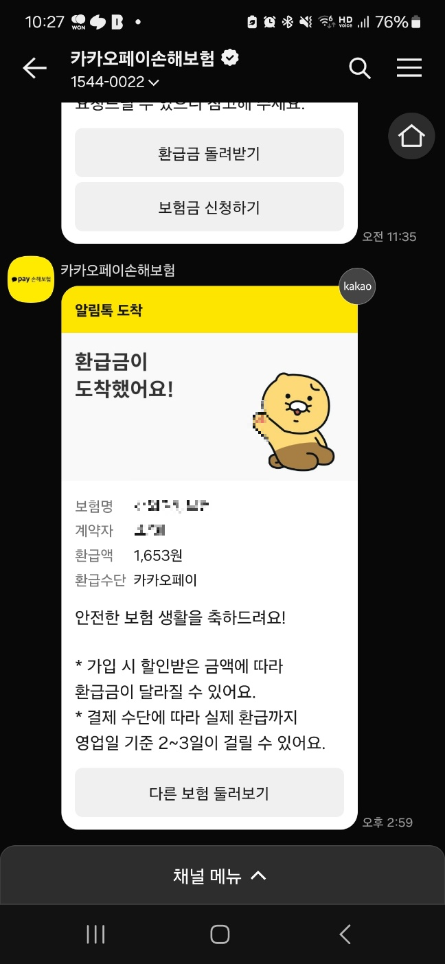 9. 짜잔~ 1,653원이라는 금액이 환급되었습니다. 인당 5,500원 정도의 금액으로 등록했으니 실제로는 3,800원가량의 금액으로 여행자보험을 들었네요ㅎㅎ