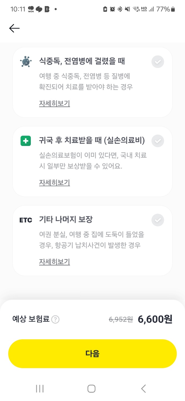 5. 추가로 선택할 수 있는 보험이 있어요. (단, 실손보험의 경우 국내 치료에 한하여 보장되고 기존 실손 보험을 가지고 있으신 분들은 중복 보장이 되지 않으니 체크하실 필요가 없습니다.)
