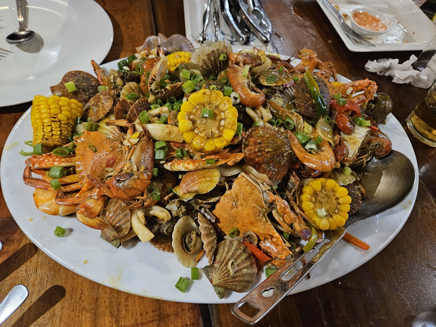 오징어튀김은 무난한 맛이고 지글지글한 시시그는 크리스피함이 더해져 바삭 짭조름해서 갈릭라이스와 함께 비벼 먹으니 넘 맛났습니다. 피셔맨스캐치라는 해산물 모둠은 오징어, 꽃게, 가리비, 새우 등 여러 해산물이 어우리진 찜 같은 건데.. 양도 푸짐하고 필리핀에서 처음 시도해 보는 해산물 요리라 기대반, 걱정반이었는데 생각보다 너무 맛나게 잘 먹고 왔습니다. 산미구엘과 함께 말이죠^^