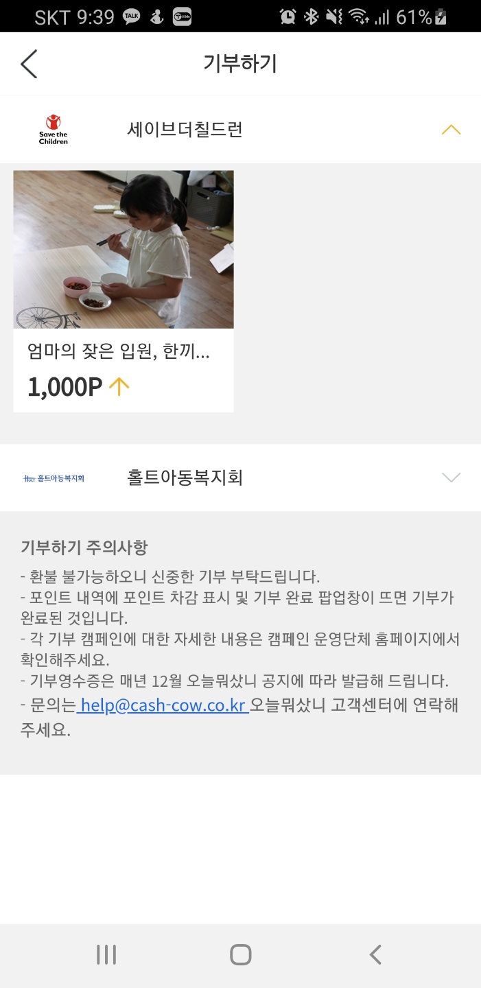 정말 고민되는 어플입니다. 제휴 매장도 많지 않은데 또 소멸하려고 준비된 포인트가 있습니다. 아무래도 오래전에 만들고 내버려 두었던 어플인데 이제 다시 시작하려니 포인트의 유효기간이 매달 앞당겨 있습니다. 그래서 얼마 모으지도 못한 포인트가 계속 매달 사라지는 것이 아까워서 1,000포인트지만 기부를 하도록 하였습니다.