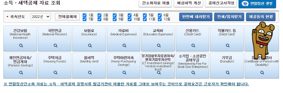 | 건강보험 | 국민연금 | 보험료 | 의료비 | 교육비 | 신용카드 | 직불카드 등 | 현금영수증 |