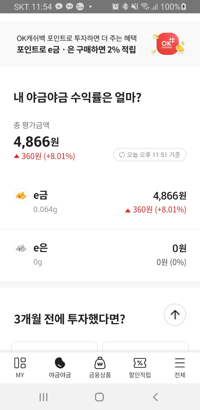 OK캐시백의 출석 이벤트 중 시럽(Syrup) 어플과 연동되는 "야금야금" 이벤트가 있습니다. 출석 체크를 통해 e-금을 모을 수 있습니다. 캐시백 포인트를 모으는 것은 아니지만 온라인 금을 투자한다는 매력과 추후에 비과세 혜택으로 매매가 가능하기 때문에 OK캐시백을 이용하신다면 함께 이용해 보는 것도 좋을 것 같아 추천드립니다. 관련 포스팅도 첨부해 드릴게요!