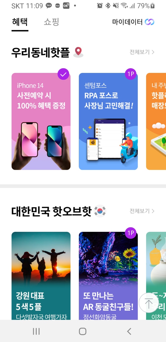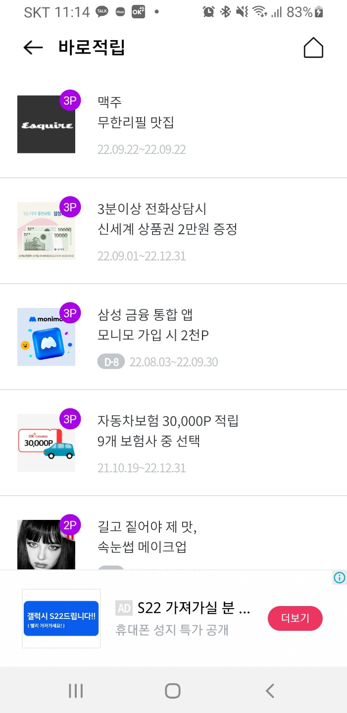 OK캐시백 앱을 켜면 가장 먼저 배너의 광고가 보입니다. 1p에서 5p까지 광고들이 뜨게 되는데 한 번씩 클릭해서 포인트를 적립해주세요. 보통 광고들은 1주일마다 리뉴얼되는 편이고 장기 광고는 1개월 정도 진행하는 것 같습니다.